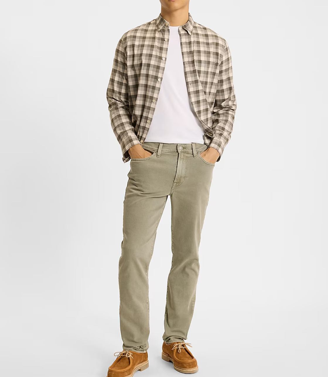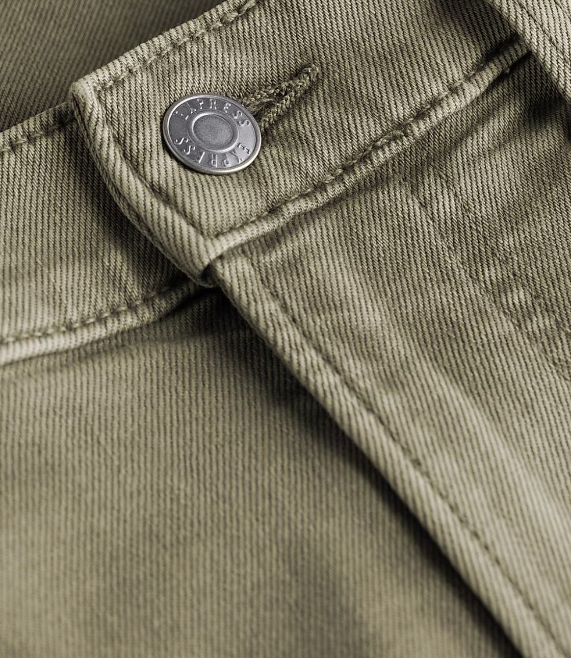Jeans Express phom Slim Fit , chiếc quần jeans màu olive nhạt này ôm sát phần đùi và ống quần, được làm từ chất liệu co giãn cao cấp. Quần có khóa kéo, một nút cài, đai quần và kiểu dáng năm túi truyền thống.