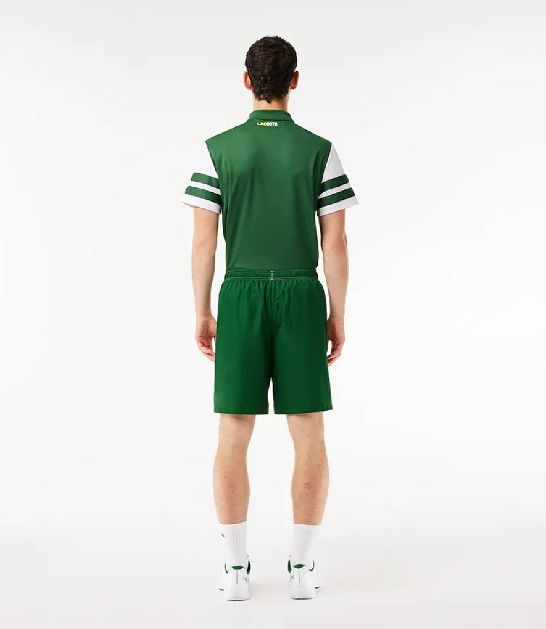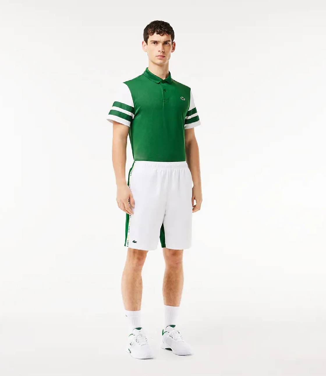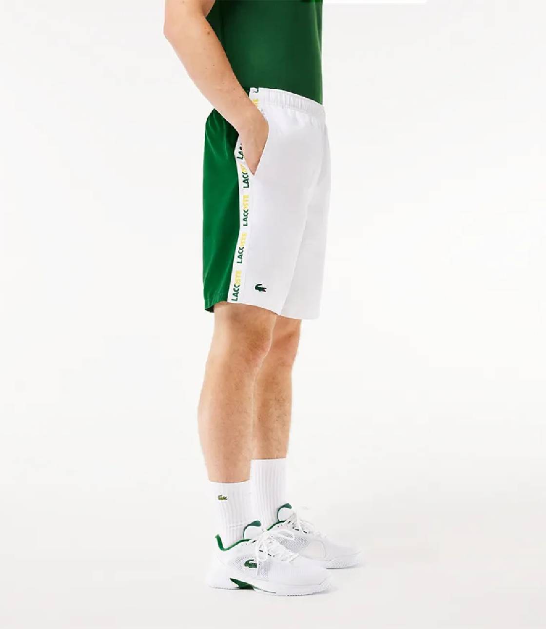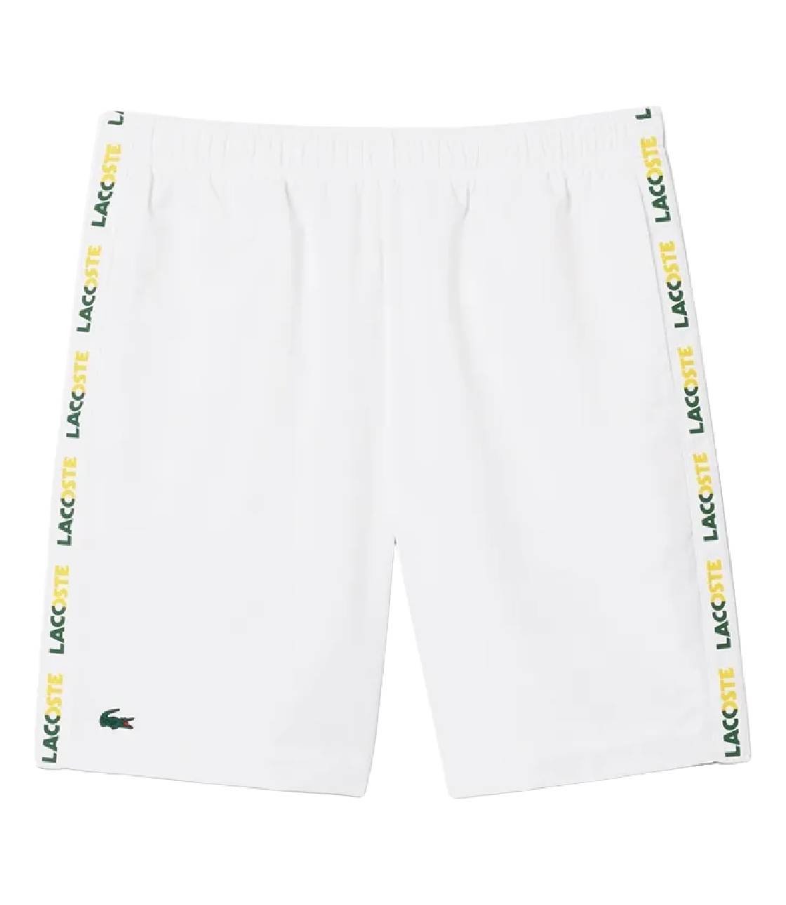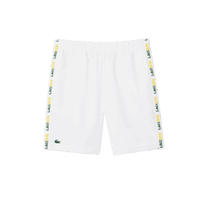 Quần short thể thao chuẩn phom với chất liệu Polyester, vải dù lạnh thoáng mát phù hợp dễ vận động, ống quần suông dễ mặc, chất vải mềm dễ mặc, 2 bên hông có in dải chữ thương hiệu “Lacoste”
