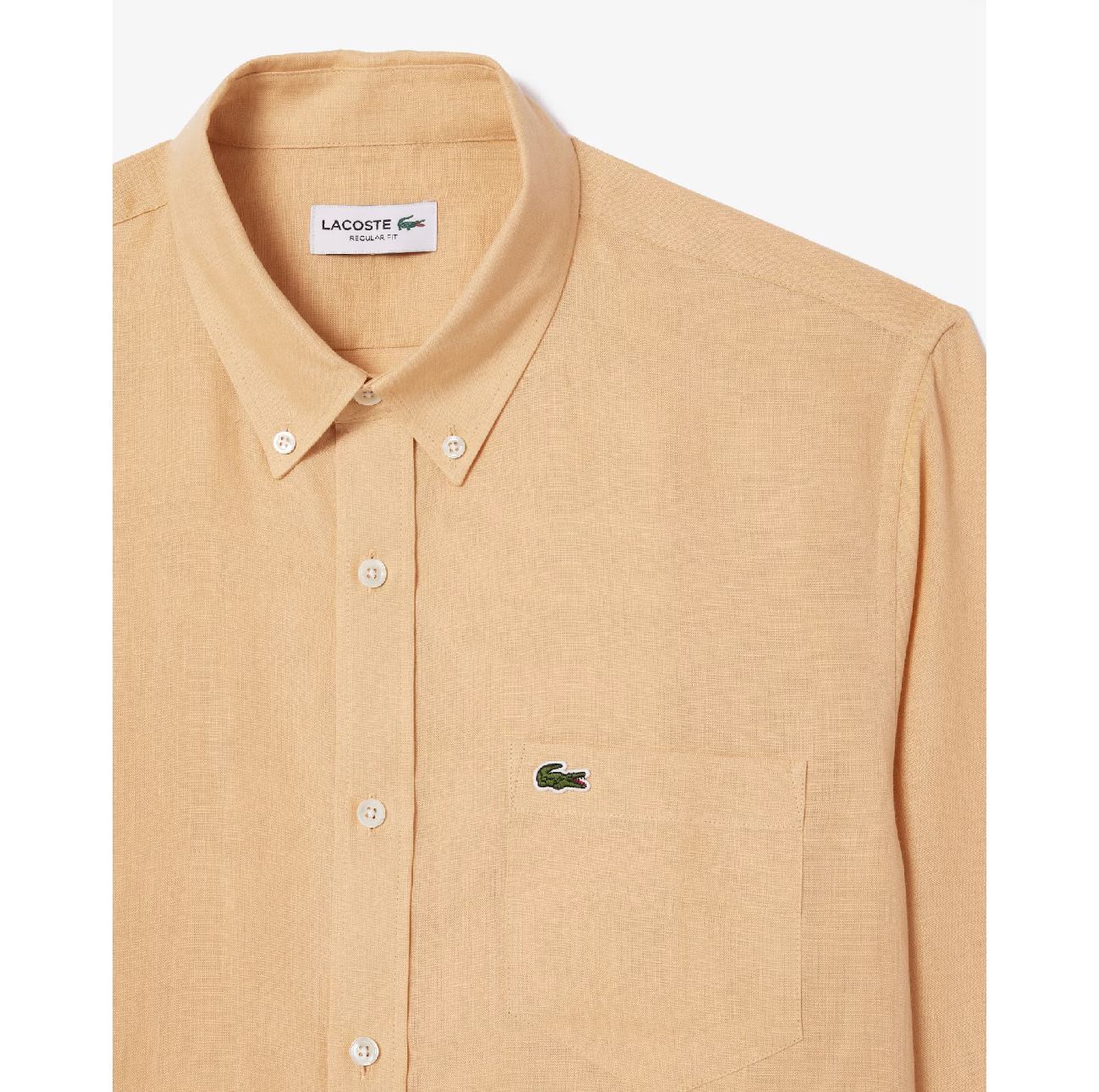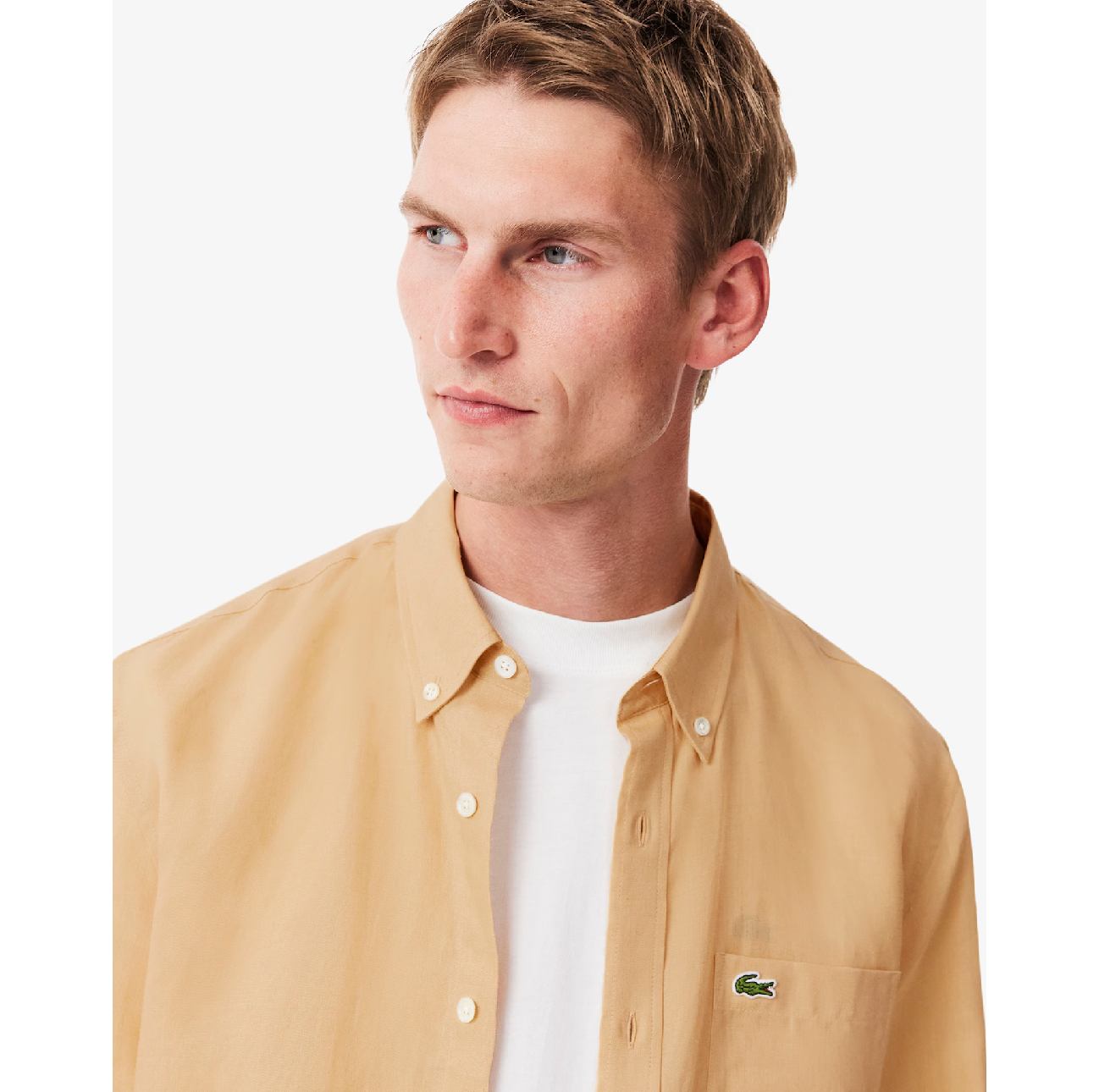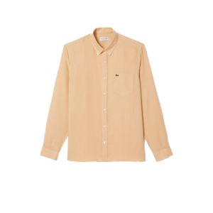 Phối chiếc áo sơ mi Lacoste regular fit vải linen mềm mại, mỏng mát . Chiếc áo thoải mái này có cổ áo kiểu Philadelphia và một chú cá sấu nhỏ màu xanh lá cây thêu trên ngực.