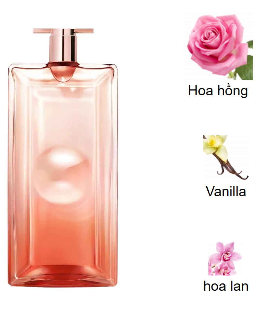 Ngay từ lần xịt đầu tiên, nước hoa Lancome Idole Now mở ra bằng mùi hương hoa hồng đặc trưng nhưng được làm mới theo cách trẻ trung và hiện đại hơn. Nhưng chỉ sau vài phút, sự xuất hiện của hoa lan hồ điệp làm mềm đi lớp hương ban đầu, chuyển sang một không gian mùi hương nữ tính, sang trọng và hơi hướng phấn nhẹ. Lớp hương cuối kết lại với vanilla phương Đông, không quá ngọt mà đầy mượt mà và ấm áp, mang lại cảm giác dễ chịu và đáng nhớ.