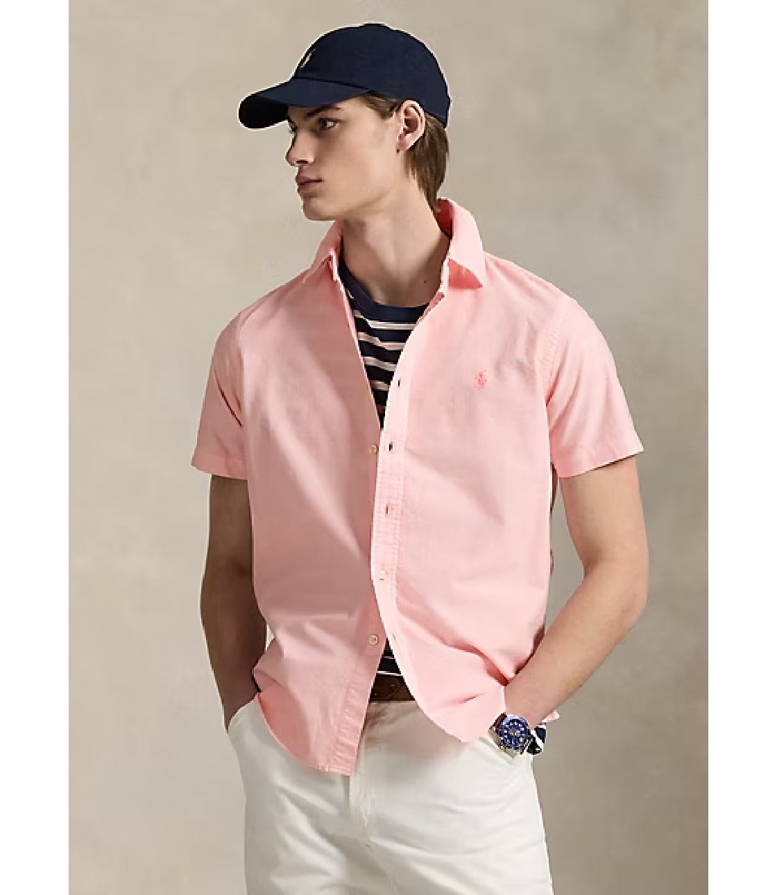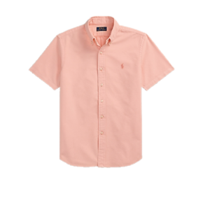 Sơ mi màu Hồng với hoạ tiết logo “Ralph Lauren” thêu sắc nét bên trái ngực áo. Phom Classic rộng rãi thoái mái, dễ mặc