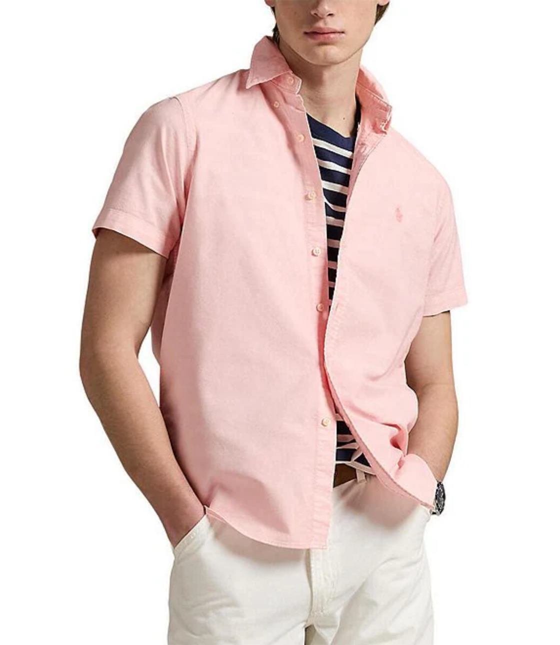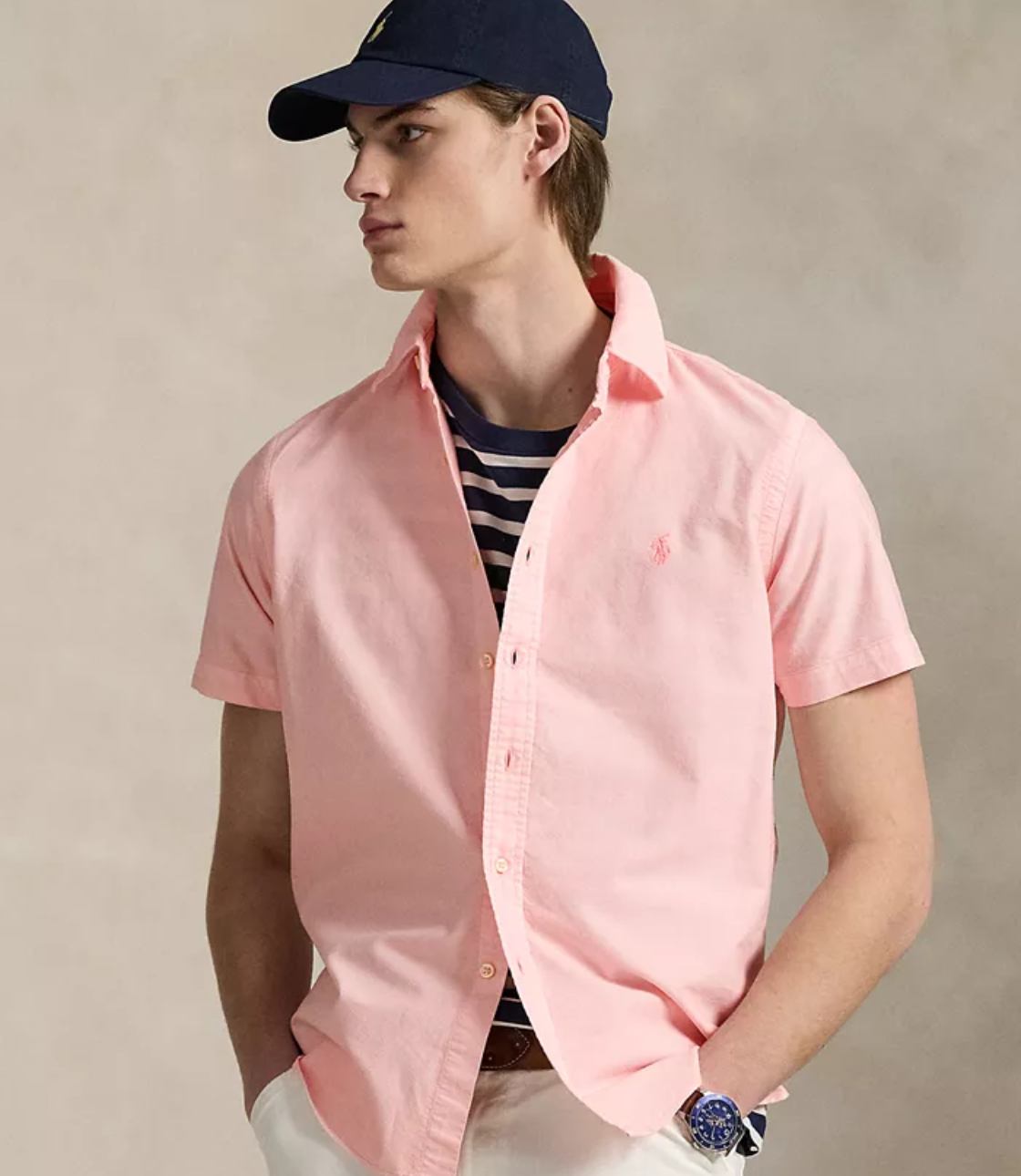 Sơ mi màu hồng, tay ngắn với hoạ tiết logo “Ralph Lauren” thêu sắc nét bên trái ngực áo. Phom Classic rộng rãi thoái mái, dễ mặc